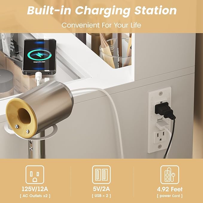 - Convenient Charging Station: Vanity with lights includes 2 AC outlets, 2 USB ports and a hair dryer stand, allowing you to conveniently connect and charge your hair tools, phones and other devices. Whether for daily grooming, leisure, or work tasks, makeup table is designed to enhance your comfort and efficiency