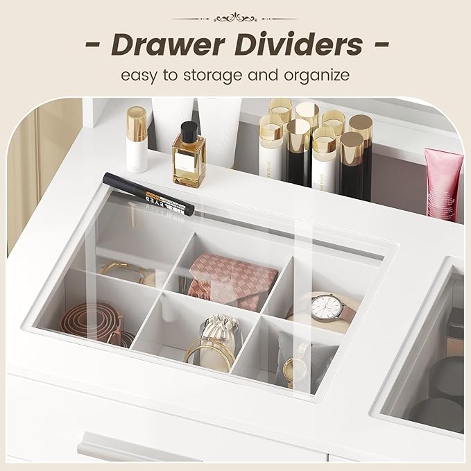 - Vanity with Glass Top: White vanity desk features a tempered glass surface that enhances its transparent aesthetic, allowing clear visibility of items stored inside the drawers. Our drawer includes adjustable dividers to help keep the vanity set organized, neatly arranging your jewelry and cosmetics
