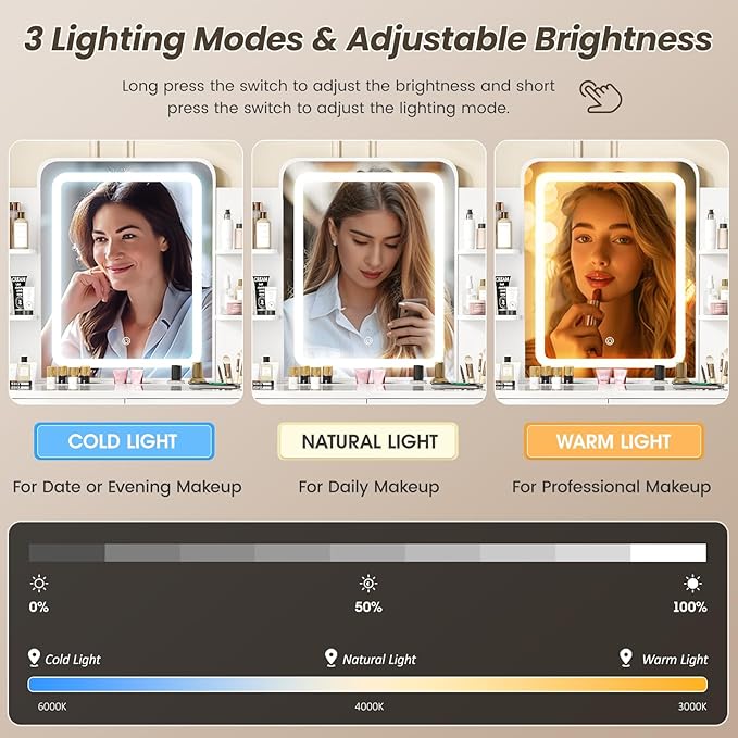 - Bedroom Vanity with 3 Lighting Modes & Adjustable Brightness: Vanity mirror with lights provides three color options: cold light for date or evening makeup, natural light for daily use, and warm light for professional makeup. Simply touch the switch to adjust modes, and long-press to adjust brightness effortlessly