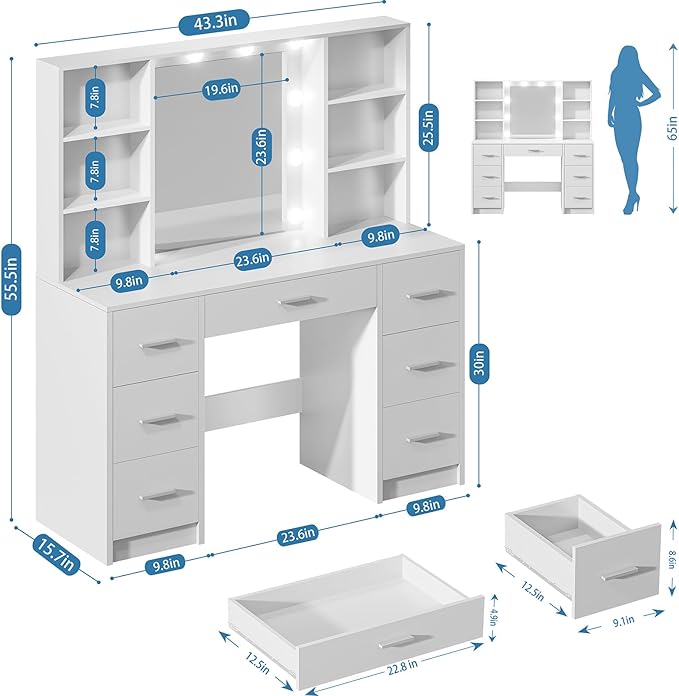 - About Assembly :Our dressing table provides detailed assembly instructions, all parts and accessories are clearly labeled. You can first arrange each part by number and then assemble it, the whole process is as fun as a jigsaw puzzle! Vanity Size: 43.3(W) x15.7(D)*x55.5(H)