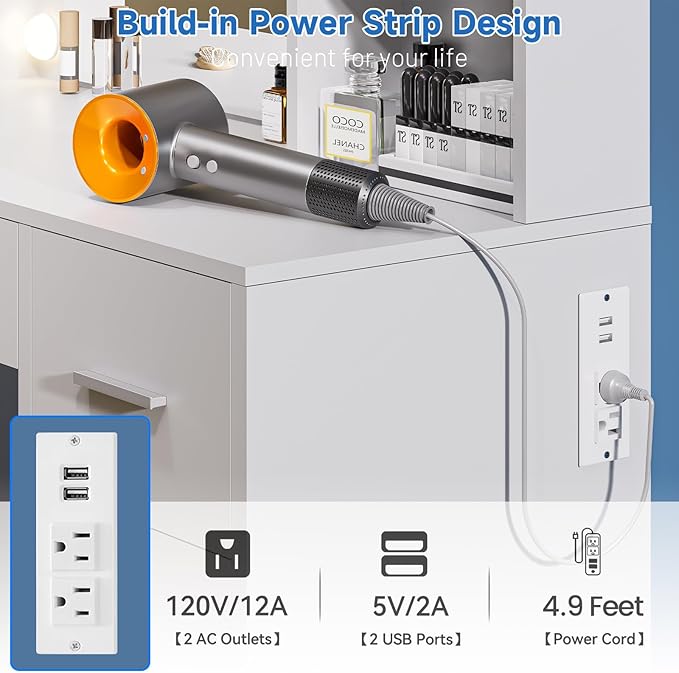 - Makeup Vanity with Charging Station: The side of the vanity table is equipped with a power strip with 2 USB ports and 2 sockets, allowing you to charge your phone while applying make-up.You can also connect live streaming devices for live broadcasting under the perfect light of the vanity. When connecting the curling iron, you will be able to apply make-up and do hairstyles in the same place, which is a great convenience for you