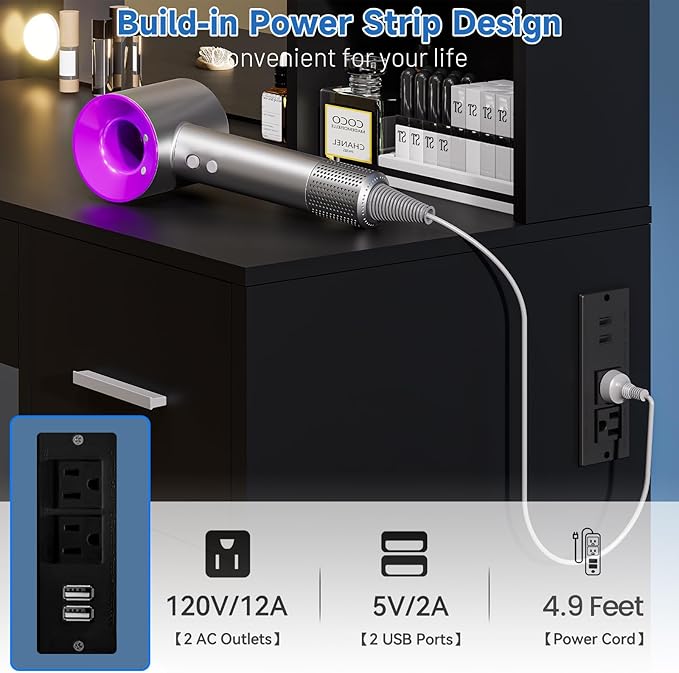 - Makeup Vanity with Charging Station: The side of the vanity table is equipped with a power strip with 2 USB ports and 2 sockets, allowing you to charge your phone while applying make-up.You can also connect live streaming devices for live broadcasting under the perfect light of the vanity. When connecting the curling iron, you will be able to apply make-up and do hairstyles in the same place, which is a great convenience for you