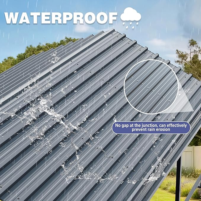 - Attractive Design: The galvanized steel roof adds a sleek, modern look to your outdoor space. Around the panel, we also attached protective tape to prevent you from being scratched by the sharp panel.