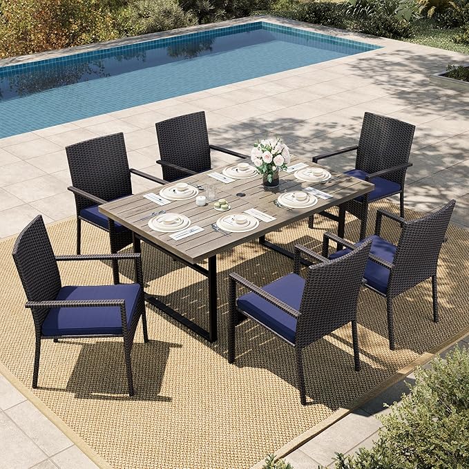 - 【A PRACTICAL PATIO DINING SET FOR 6】Including 1 x 64" wood look patio table with 1.6" & 2" adjustable double umbrella hole, 6 x wicker dining chairs. Perfectly fitting with your backyard, poolside, balcony, garden and deck to create an outdoor comfort zone. A REAL PRACTICAL dining set perfectly meet the requirement of enjoying outdoor leisure time like a meal or host a party with your family or friends