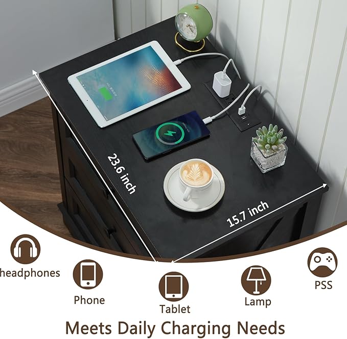 Farmhouse 3 Drawers Dresser for Bedroom, Rustic Small Chest of Drawers with Charging Station, Wood Closet Organizers, Black Modern Tall Nightstand/End Table for Bedroom, Living Room, Entryway