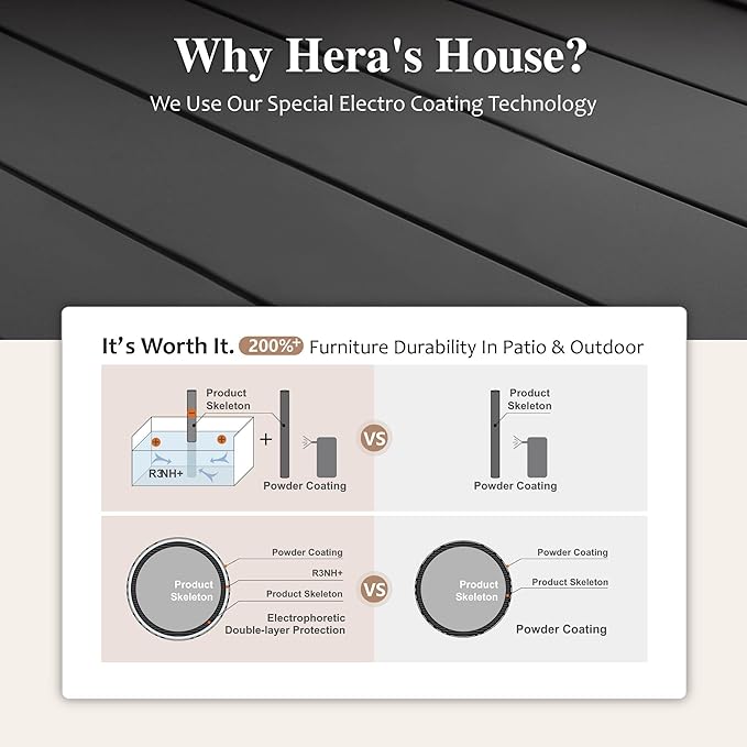 - 【DURABLE FOR OUTDOOR AND INDOOR】All the HERA’S HOUSE CHAIR/TABLE steel frame are processed by high-performance E-COATING and POWDER-COATING technique which provides extended protection against rust, scratches, rain, and UV harm. All weather resistant, anti-rust, easy to clean, no special care needed