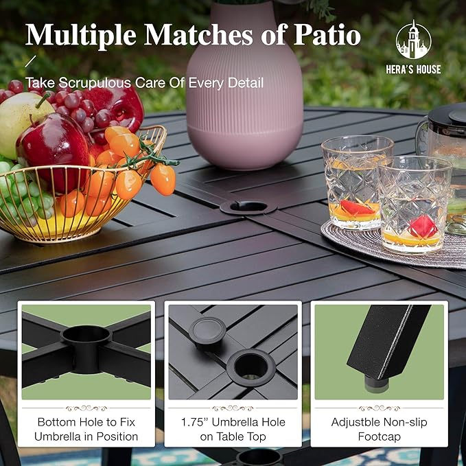 - 【MORDEN SLATTED METAL TABLE TOP WITH UNMBRELLA HOLE】HERA’S HOUSE slatted metal table top leaves enough water seepage gaps, which is easy to clean and won’t accumulate water. The center pre-cut hole allows you to add an umbrella to protect you and your family from UV damage. Φ1.57” suitable for most umbrella in the market