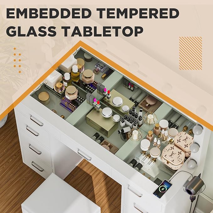 - 【Glass Top Vanity with 9 Large Drawers 】Try Likein makeup table with great storage function, the visual glass top is convenient for you to enjoy or find jewelry and your belongings. 9 large sliding drawers will solve your storage worries! Allowing you to neatly store and organize your collection of makeup, fragrances, hair tools, and other essential beauty items. Say goodbye to cluttered countertops