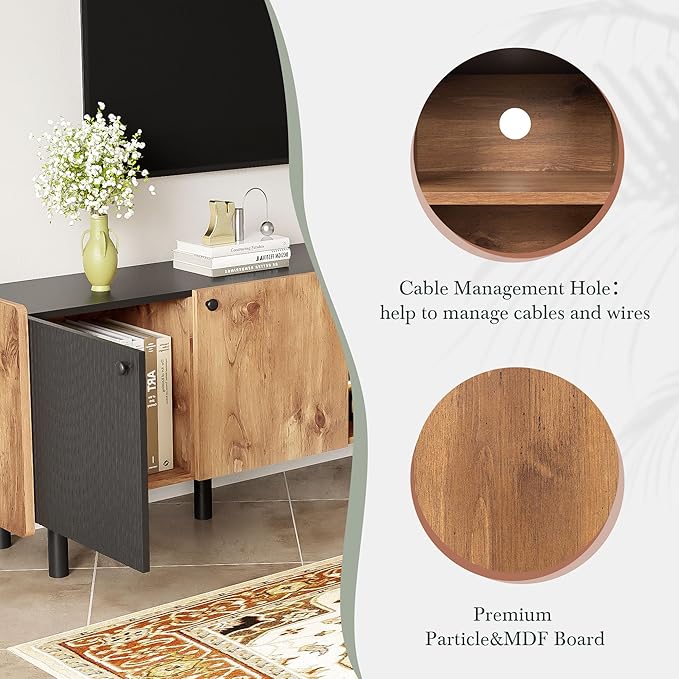 - Modern Mid-Century Design: This TV stand blends sleek, contemporary lines with mid-century modern charm, featuring a striking black and walnut color contrast. The unique fluted panel design on the cabinet doors adds texture and visual interest, elevating the overall aesthetic and bringing a touch of sophistication to your living room.