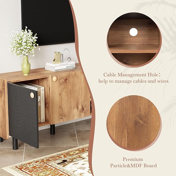 - Modern Mid-Century Design: This TV stand blends sleek, contemporary lines with mid-century modern charm, featuring a striking black and walnut color contrast. The unique fluted panel design on the cabinet doors adds texture and visual interest, elevating the overall aesthetic and bringing a touch of sophistication to your living room.