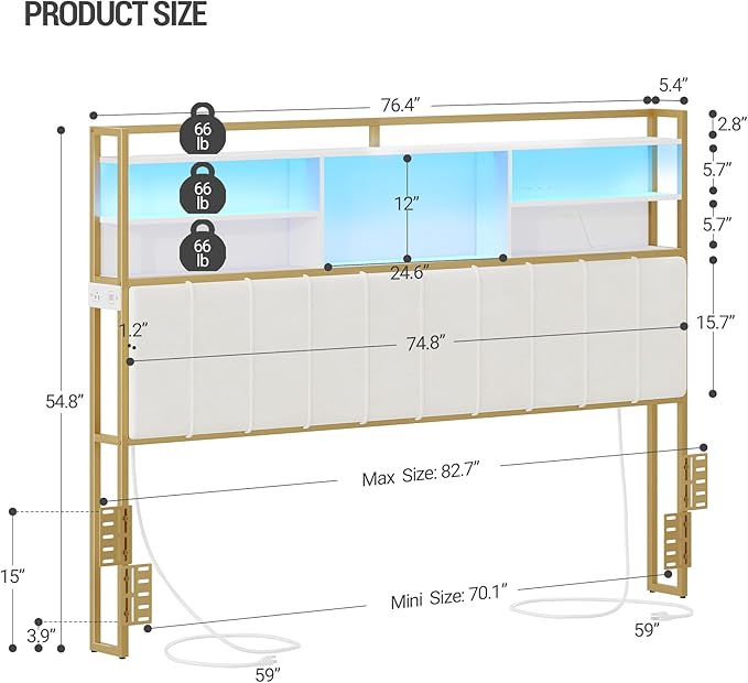 - Large Storage Space & Sturdy Structure: Large Storage Space & Sturdy StructureThe headboard is made of selected particleboard and sturdy metal frame, without shaking or noise. And the top of the headboard is equipped with 3-tier adjustable storage space, which can hold books, phones, clocks or some personal belongings and each has a load-bearing capacity of 66 lbs. The height of the storage space can be adjusted up to 9.5 inches to meet various storage needs