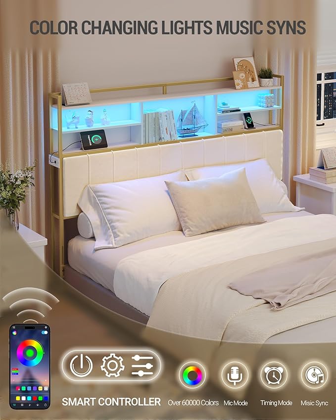 Headboard with 3-Tier Storage Shelves, Velvet Upholstered Head Board with 2 Outlets, USB Ports & LED Light, Soft Backrest for King Size Bed, White and Gold BH19403A