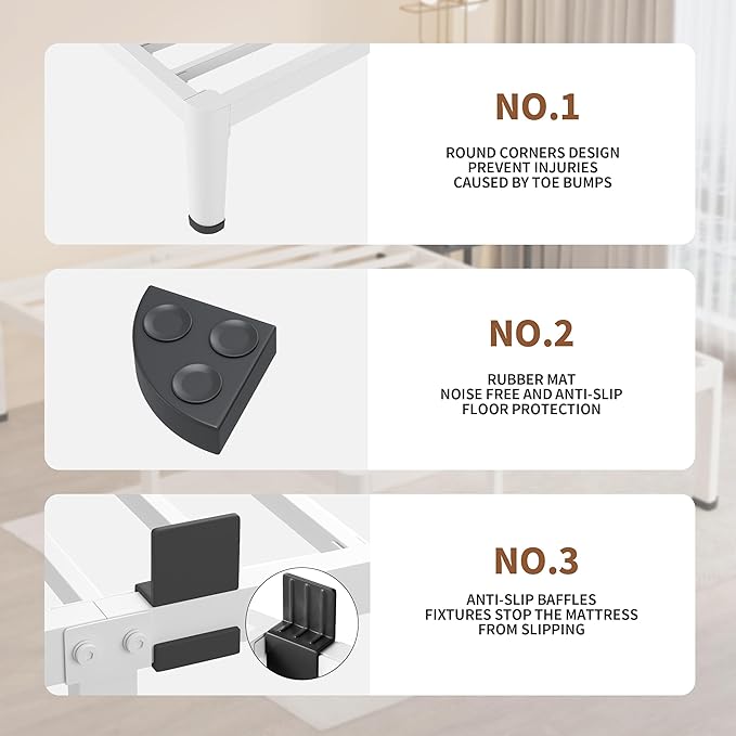 - Anti-Slip Design: The queen bed frame has extra plastic anti-skid baffles on all four sides to prevent the mattress from slipping, as well as rubber foot cushions to prevent the queen metal bed frame from sliding and protect the floor from scuffing while reducing noise.