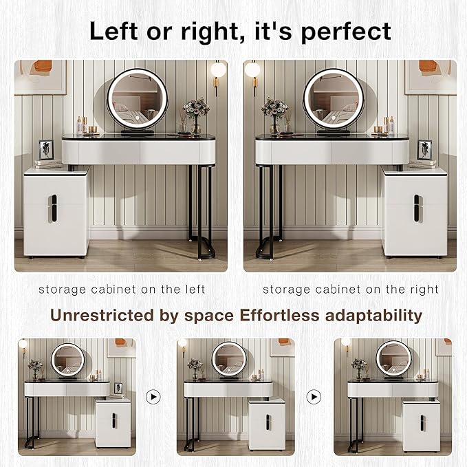- Reversible Side Cabinet – Space-Saving and Multi-Purpose: The extendable side cabinet (adjustable from 39.37" to 50") can be installed on either side to fit your room layout. Perfect for small vanity setups or larger modern vanities, it also doubles as a nightstand when fully extended—aligning neatly with your bed height. A clever solution for maximizing space in tight bedrooms or apartments.