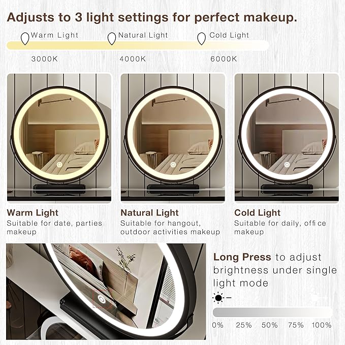 - 3-Color LED Mirror with Touch Control: Equipped with 168 high-quality LED beads, this mirror offers 3 lighting modes—cool, warm, and natural—to suit different times of day or makeup styles. One-touch control lets you switch modes easily, and long-press to adjust brightness. The adjustable, detachable design lets you tilt the mirror for the perfect angle, or remove it completely to transform your vanity into a small desk or home workstation.