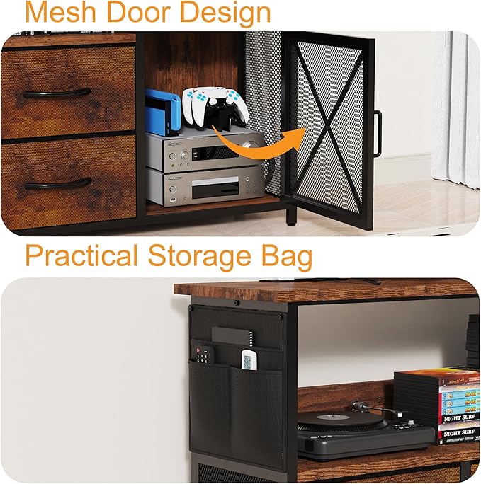 - Safe and Cool Design: An additional metal tube under the tabletop supports heavy TVs. A backboard on the middle shelf prevents items from falling. The color combination, the dark brown outlook and the black mesh door, adds an retro style to the dresser table