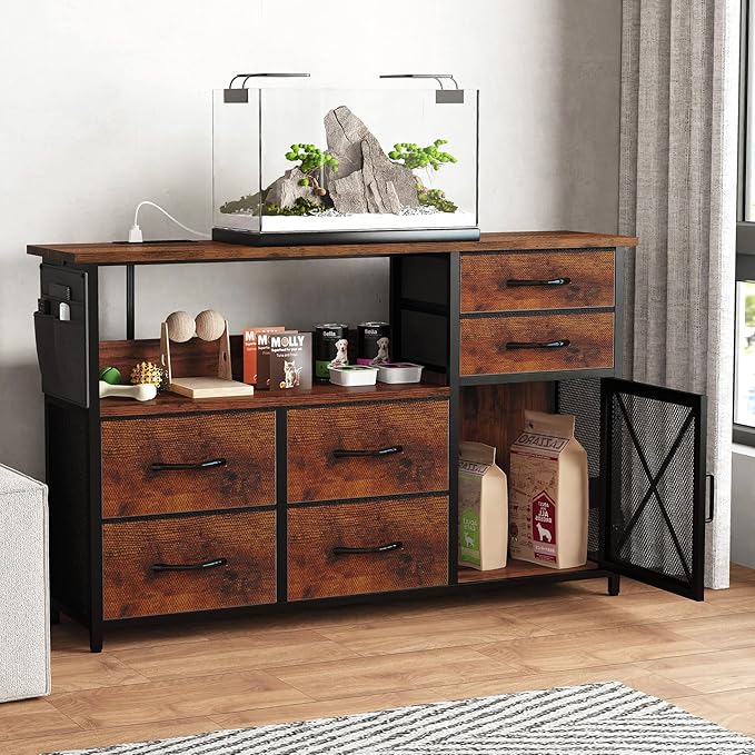 TV Stand Dresser for Living Room, LED TV Stand with 6 Drawers and Lights for Bedroom, Up to 50 inch TV, Long and Wide Dresser Storage Table with Metal Door, Rustic Brown