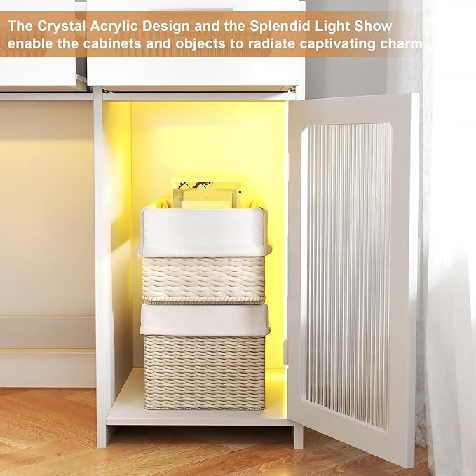 - BEAUTIFUL AND PRACTICAL: 2 drawers and a cabinet door are made of sparkling acrylic, giving your house a simple, modern aesthetic. When the light is lit, it adds to the dreamy atmosphere, and the light shines through the acrylic, reflecting a soft and charming halo. Not only makes the dresser a place of storage, but also makes it a visual focus in the bedroom