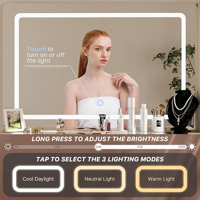 - HD Mirror & 3 Adjustable lights: Featuring 36-inch full-sized HD mirror for clear, accurate reflection ensuring precision in every makeup application. LED lights offer 3 settings natural, warm, and cool with adjustable brightness perfect for creating the ideal lighting, from daytime glow to evening glam