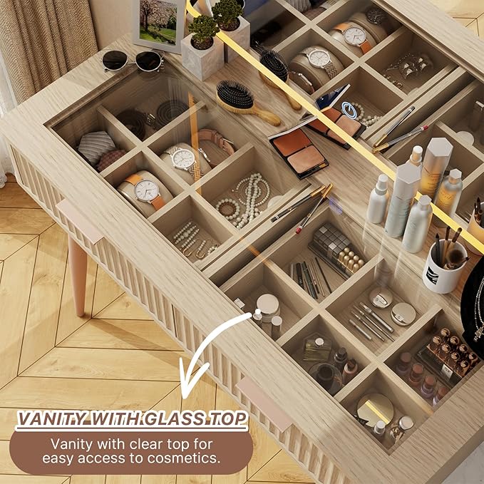 48" Fluted Makeup Vanity Desk with 36" Mirror and 3 Modes Lights, Glass Top Dressing Table with Jewelry Organizer Cabinet, Storage Cabinet, 3 Drawers, Charging Station for Bedroom, Oak