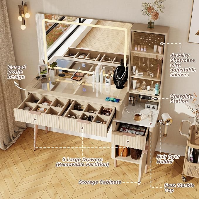 - Meet Your Storage Needs: Featuring 3 storage compartment, 3 drawers, and storage Cabinet. The vanity offers plenty of space to organize all your makeup essentials. Combining practicality and elegance ensures everything stays tidy and within reach
