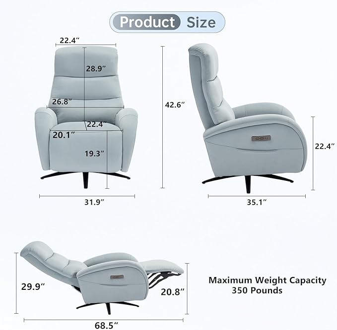 - 170° Recliner Swivel Chair: This extra wide recliner is specially driven by dual motors, allowing you to easily find any position you want. Attention: This oversize recliner chair comes with a power source, not a backup battery. (Maximum tilt angle: 170 °)