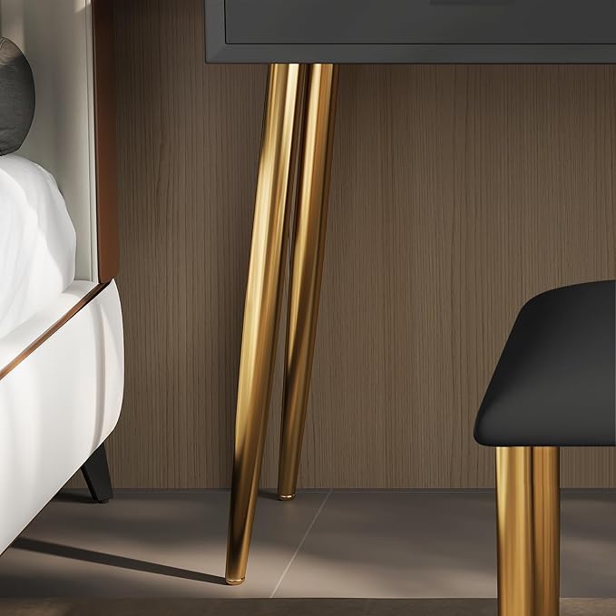 - 【Premium Materials & Sturdy Construction】We use a combination of solid wood frame structure and MDF, and the table legs are made of stainless steel gold-plated parts to ensure the stability and long-term use of this makeup vanity desk. The square stool is wrapped in high-elastic sponge and soft PU, so you won't feel tired even if you sit for a long time.