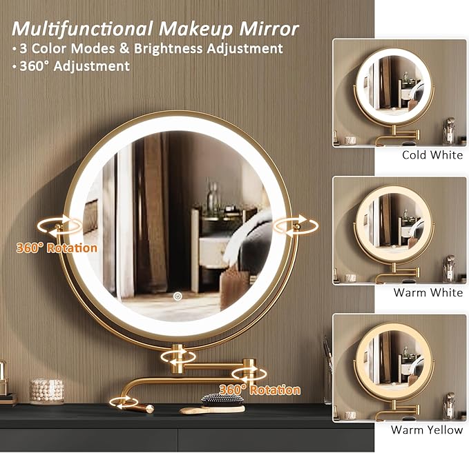 - 【360° Rotating Vanity Mirror】 This small vanity is equipped with a multi-angle rotating mirror that illuminates your beauty in all directions. The light source is soft and not dazzling. It also provides 3 color modes and stepless dimming. Click to adjust the color (warm yellow, warm white and cool white) and long press to adjust the brightness. To adapt to various scenes and makeup needs, you can enjoy a professional make-up experience at home.