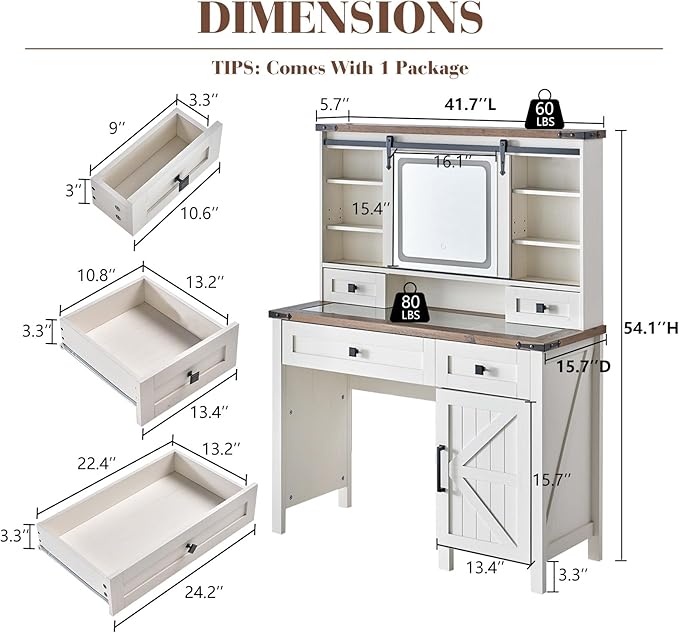 - [Small Farmhouse Vanity] Overall Measuring: 41.7''W*15.7''D*54.1''H, rustic wood grain finish, exquisite metal track, corner arrow decor, and barn door trim add farmhouse charm & elegance. An ideal gift for your wife, mom, daughter, or friend