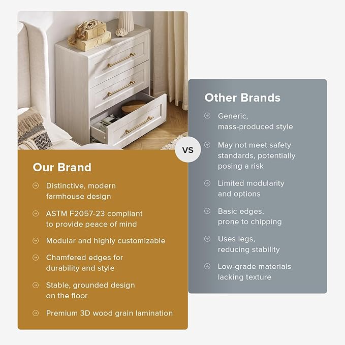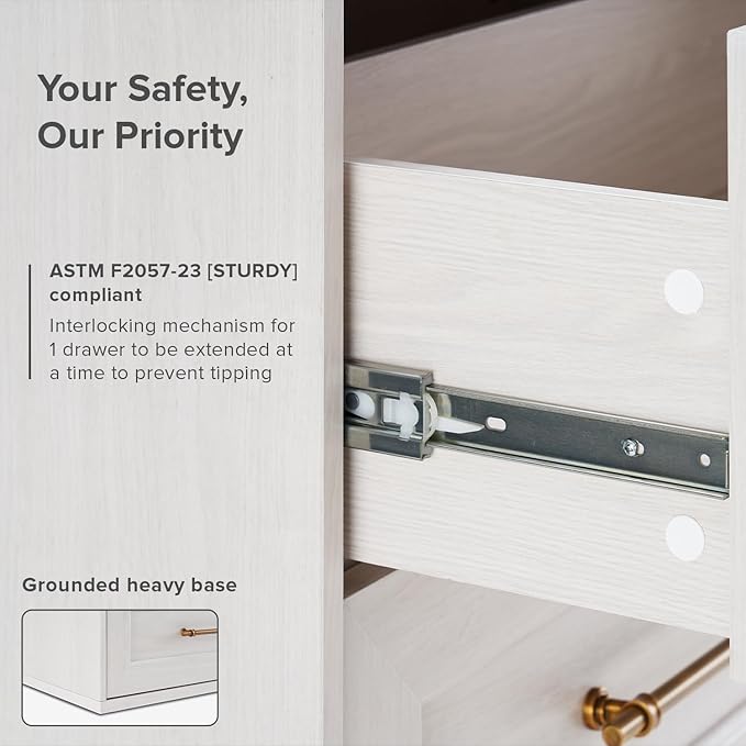 - Reliable & Safe: Engineered for safety, the Blake Dresser is put through stringent quality checks to be able to store up to 30lbs for each drawer. Being ASTM F2057-23 [STURDY] compliant, it is designed with interlocking mechanism for 1 drawer to be extended at a time to prevent tipping. For added safety, an anti-tipping kit is included