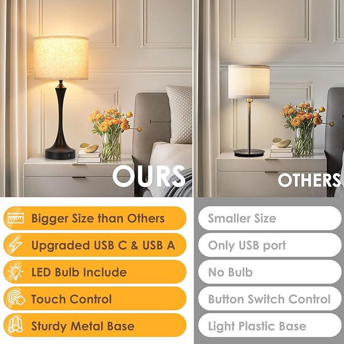 - USB & Type-C Charging Ports: Keep your devices powered with built-in USB-A (5V/2.1A) and USB-C ports. This touch lamp lets you charge your smartphone, tablet, or other gadgets right at your bedside or desk, helping you stay organized while reducing clutter. A practical and stylish solution for modern living.