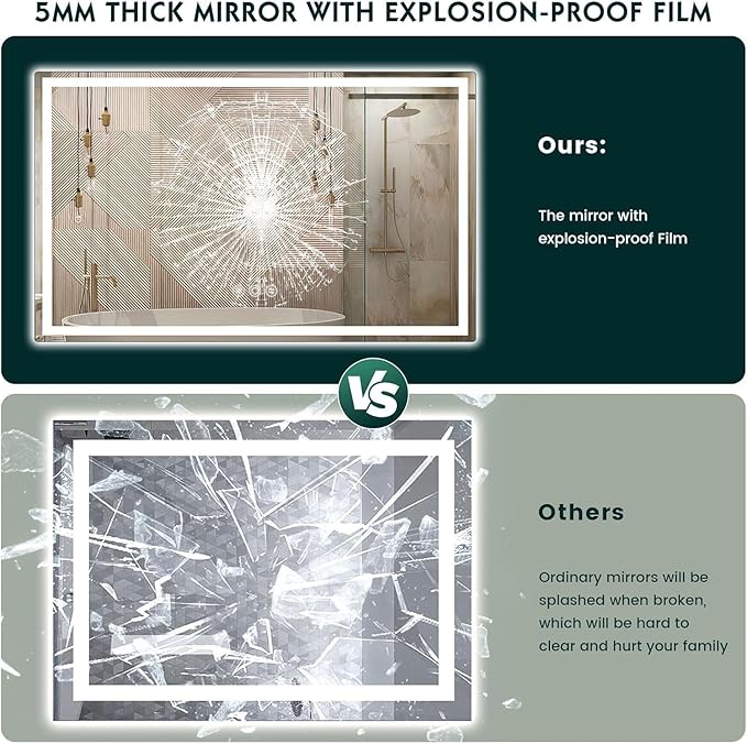 - 【High Quality】Premium 5MM silver-coated led bathroom mirror with lights comes with an extra 5x magnifying mirror that provides you with a clear reflection; Features R5 rounded corners & back explosion-proof film that greatly enhanced the sturdiness, the aluminum alloy frame is rustproof and not easy to deform, high-quality smart led light beads provide over 50,000 hours lifespan, all these details make a shatterproof and reliable large lighted bathroom mirror