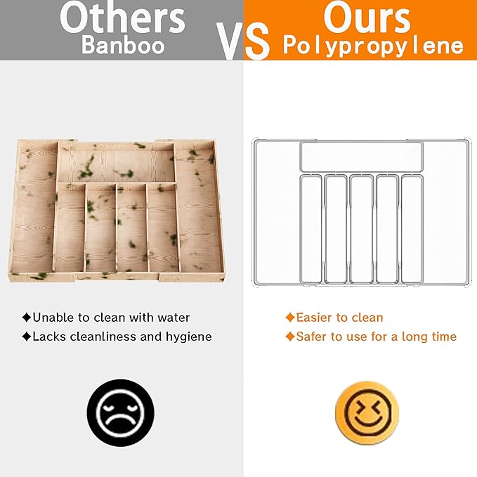 - Premium Material:Made of thick and sturdy premium PET material,the cutlery organizer is BPA free so you can rest assured that it is safe to use with all forms of tableware. The construction means it is built to last for a long time
