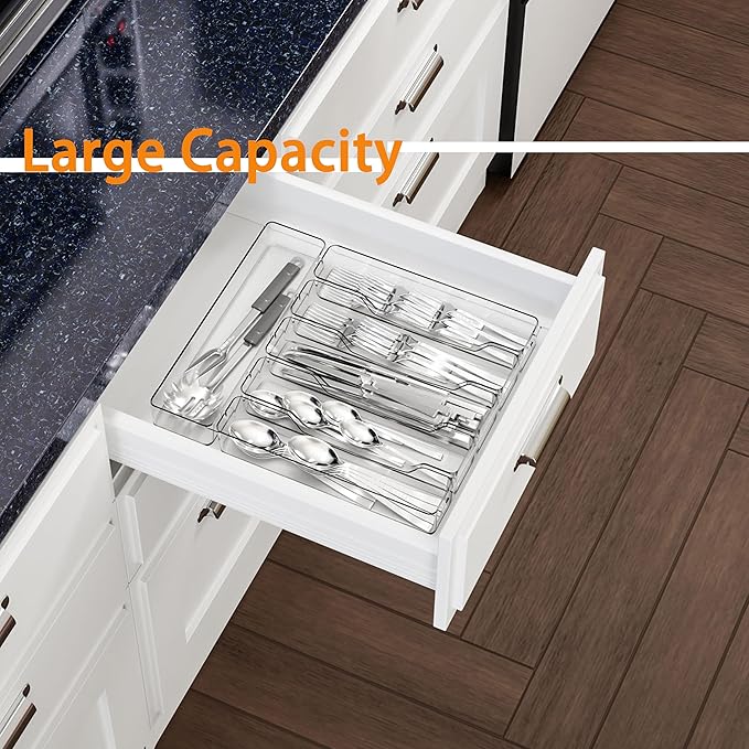 - Large Capacity:Keep your kitchen drawer organized and create more space with this silverware organizer. Features two expandable panels on the left and right to accommodate additional silverware,cutlery,and kitchen utensils