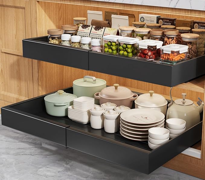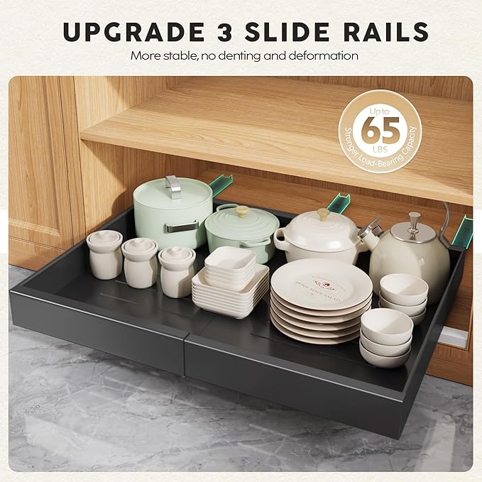- Upgrade 3 rails, Ultra-Reliable, Silent Performance: Engineered from premium-grade metal with precision damping rail guides, our cabinet organizer promises rock-solid durability and whisper-quiet operation. Tested for over 40,000 cycles, it delivers seamless opening and closing, guaranteeing a serene kitchen ambiance every time. 3 sliding rails, stronger bearing capacity, will not sag deformation, more reliable.