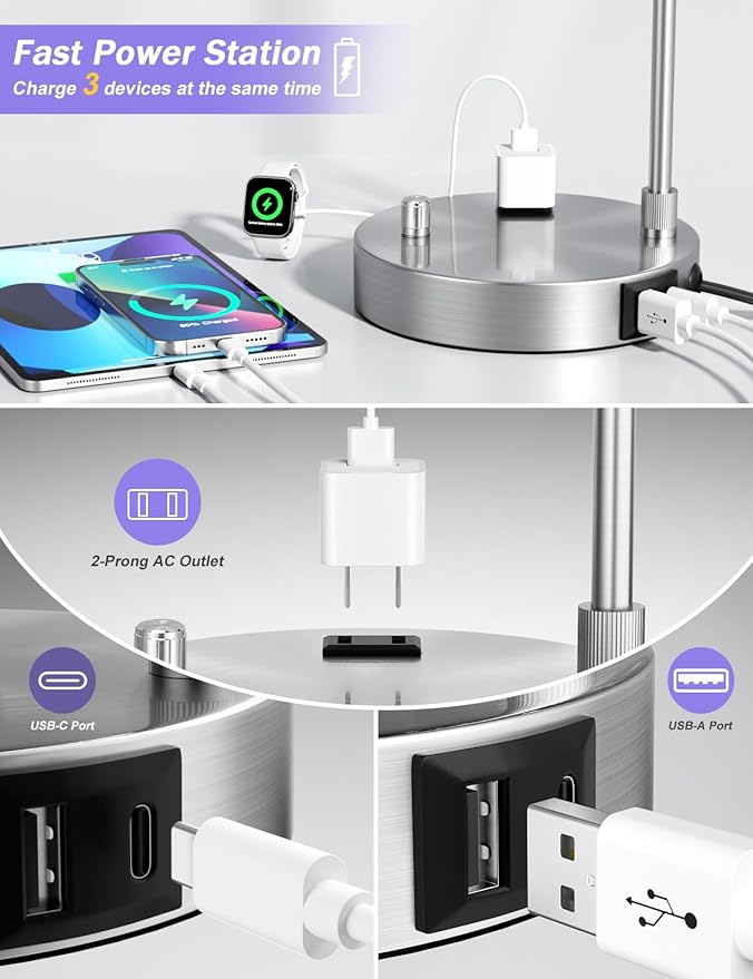 - 【Table Lamp with Usb Port and Outlet】Transform your bedside into a clutter-free charging station with dual USB-C/A ports + built-in AC outlet.The small lamp could charge up your phone, tablet, AND laptop simultaneously whether the lamp is on or off.