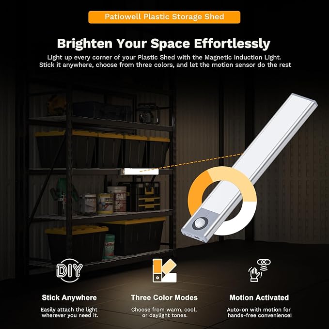 - Magnetic Induction Light: Magnetic Induction Light features a powerful magnetic base and motion sensor, providing bright, hands-free illumination for the shed. With 5-8 meters sensing range and three different lighting modes can be selected according to your needs