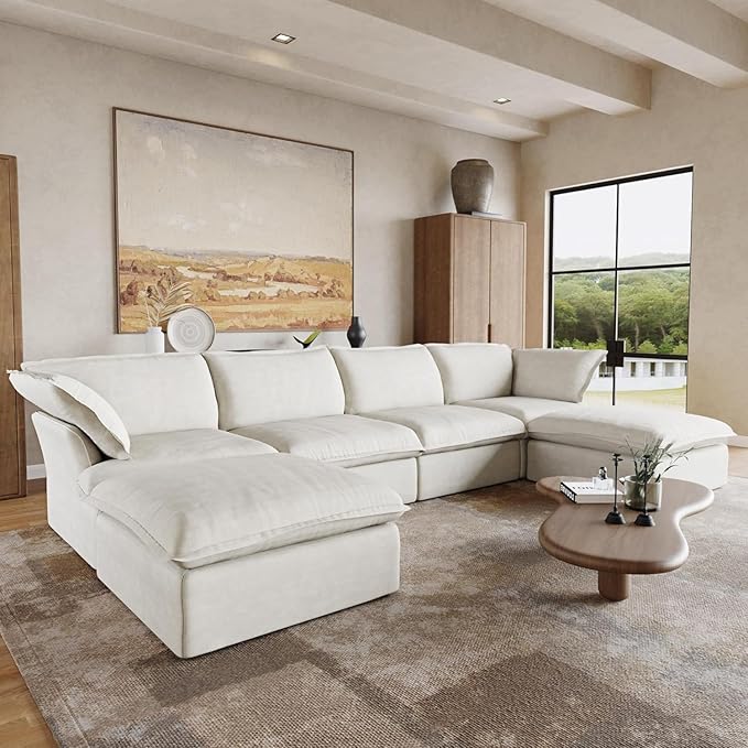 JACH U-Shaped White Cloud Sectional Couches, Deep 6-Seats Convertible Couch, Modular Sofa with Chaise Ottomans, Sofas Furniture for Living Room Bedroom Office Apartment (White)