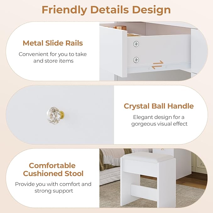 - 【Durable & Comfortable Vanity Set】The makeup vanity set crafted from sturdy engineered wood (MDF) and tempered glass, drawers are equipped with tested metal slides, providing easy access to your stored items. Anti-tip strap enhancing its stability and preventing it from tipping over. The vanity set includes a chair that is both sturdy and soft, providing comfort while ensuring the chair can support the weight.