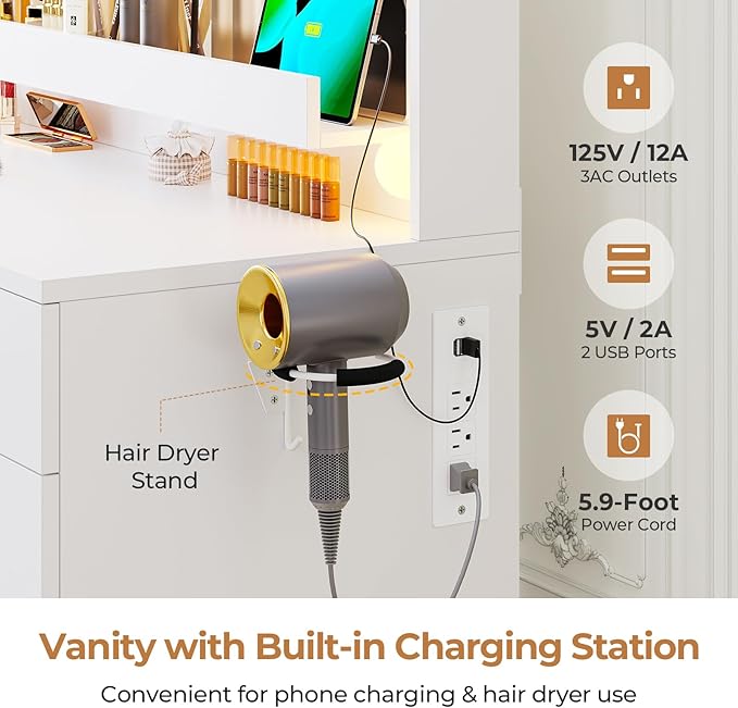 - 【Charging Station & Hairdryer Rack】This vanity table is equipped with 2 standard plug sockets and 2 USB ports, providing easy access to power for your hairdryer, phone, curling iron, and more. The side hair dryer rack ensures your styling tools are always within reach. Upgrade your beauty routine with this vanity desk, designed for convenience and style. Keeping your devices charged, without compromising the overall style or space.