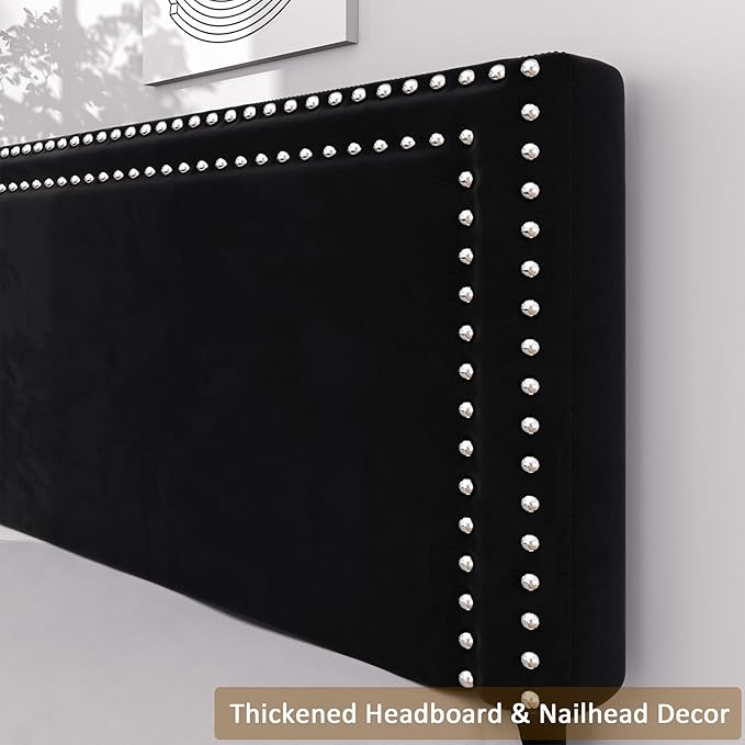- Elegant Black Velvet Upholstery with Nailhead Trim - This twin bed frame features luxurious black velvet upholstery with a sleek silver nailhead trim along the headboard, bringing a touch of sophistication to any child's room.