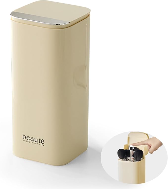 DASITON Makeup Brush Holder with Lid,4 Slots Makeup Brush Organizer,Automatic Lifting Makeup Cosmetics Organizer,for Vanity Decor,Bathroom Countertop,Dustproof Cosmetic Brushes Container(Cream)
