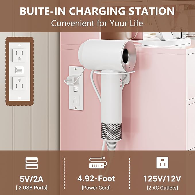 - Convenient Power and Storage: This vanity desk with mirror and lights seamlessly integrates practical features to enhance your beauty routine. Makeup table includes 2 standard power outlets, 2 USB ports, and a dedicated hair dryer rack, allowing you to conveniently charge your devices and have your hair tools readily accessible. Whether in your bedroom, salon, or for live broadcasting needs, this makeup vanity provides the perfect balance of functionality and convenience.