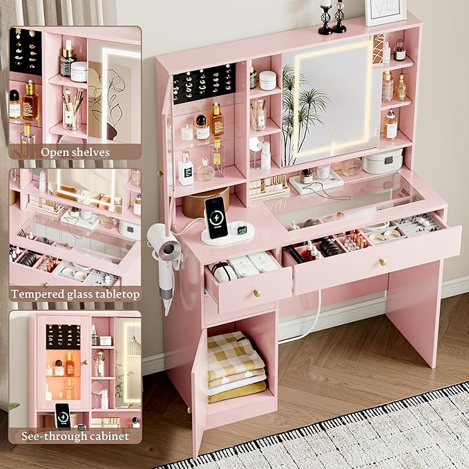 Vanity Desk with Mirror and Lights Makeup Vanity Desk with Lights 3 Colors 38" Dressing Table with Drawer and Cabinet for Bedroom Transparent Glass Top Power Outlet for Bedroom Pink