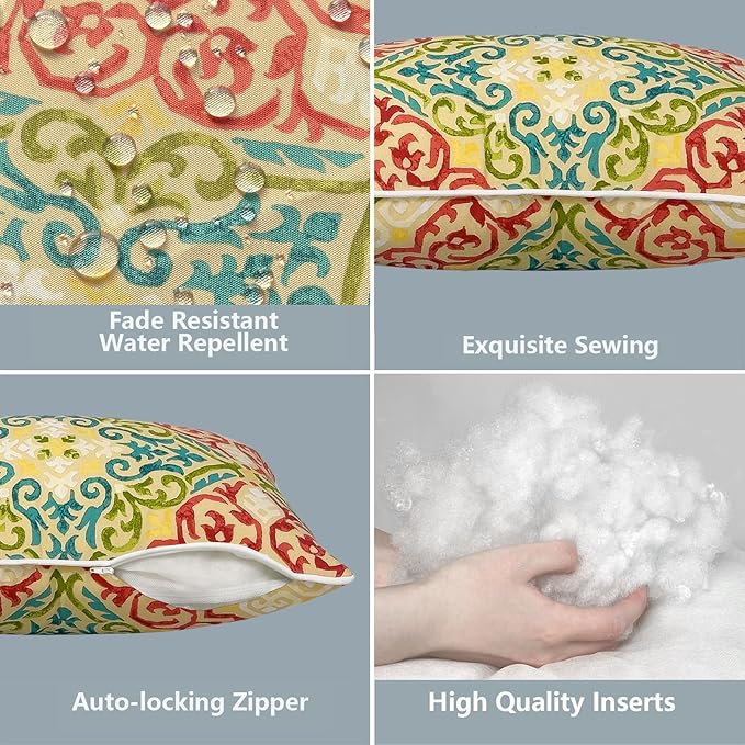 - MATERIAL - Our outdoor pillow is made of durable polyester fabric and soft polyester fiber. It's water repellent and fade-resistant, won't fading under the direct sunlight over 500 hours. The insert is filled with soft polyester fiber, overstuffed construction for enhanced comfort and longevity