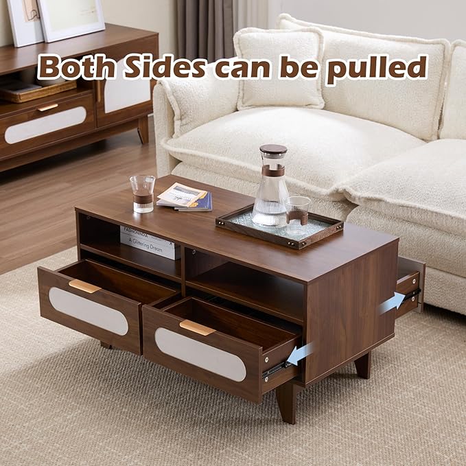 CANMOV 39 inch Mid Century Coffee Table with 4 Drawers and 2 Shelve, Rectangle Wooden Wood Coffee Table for Living Room,Walnut