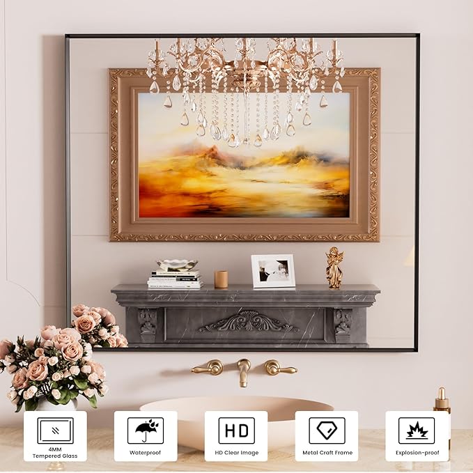 - H-D Glass, Super Clear: Our black bathroom vanity mirror adopts HD float glass technology to ensure 1:1 restoration of real image, no distortion, no shadows, super clear;