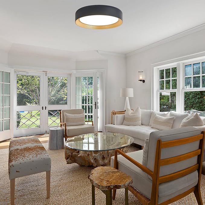 - Materials and modern design:The lampshade of the ceiling light fixtures is made of ultra-thin acrylic.Width 15.75 inches x height 3.54 inches,circular design with matte black border and built-in gold metal texture,showcasing a simple and atmospheric modern style ceiling light
