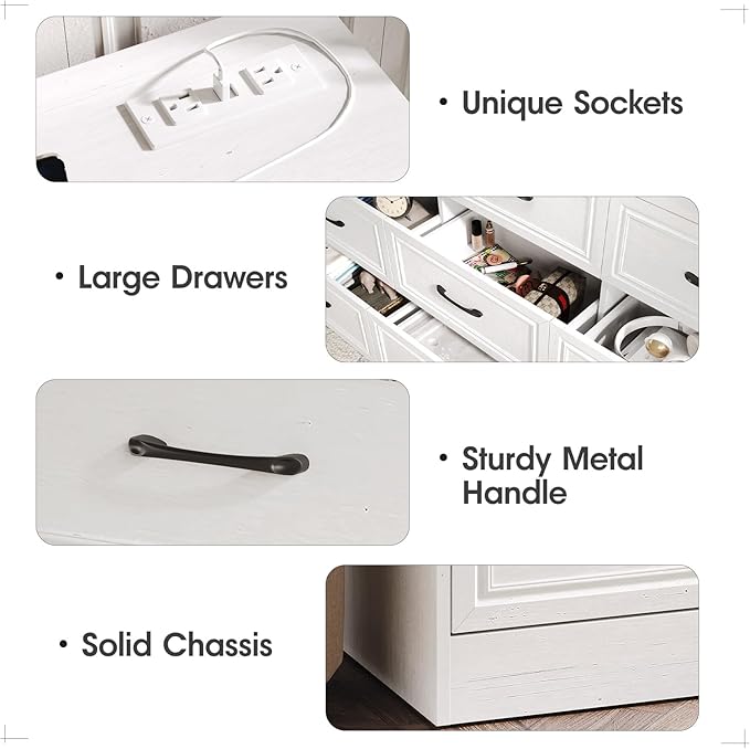 - NEW UPGRADE: This dresser adds a back panel to the product with charging station and still has no increase in price. The back is supported using a single plank of wood, no longer using iron pipes. Not only does this increase the stability of the dresser, it also prevents dust from falling and stops critters from getting in.