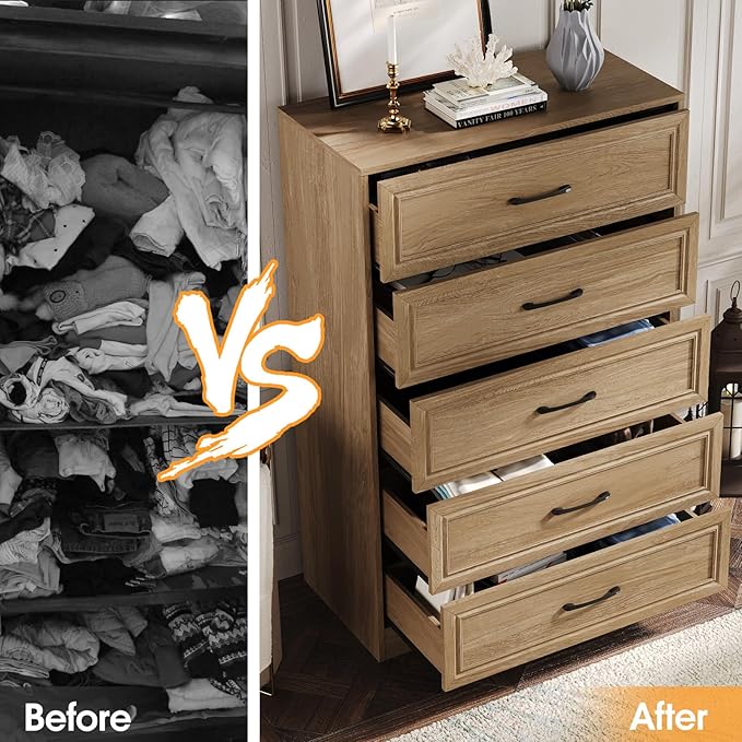 - 5 Drawer Dresser : The 5 drawer dresser provides ample storage space for your clothes, shoes, accessories, towels, blankets, and other daily necessities, keeping your room clean and tidy. And it has larger drawers that can hold more items. Whether placed in the bedroom or living room, it has its uniqueness.